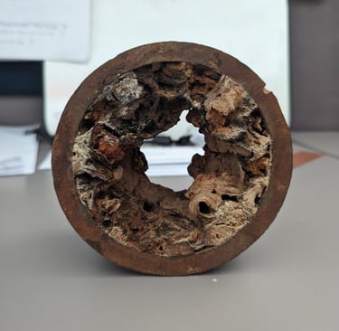 Interior corrosion & chemical attack: Waste, gases (such as hydrogen sulfide) and corrosive environments can deteriorate cast-iron from the inside out, creating thinning, cracking or collapse. Whitt Inspections, LLC
